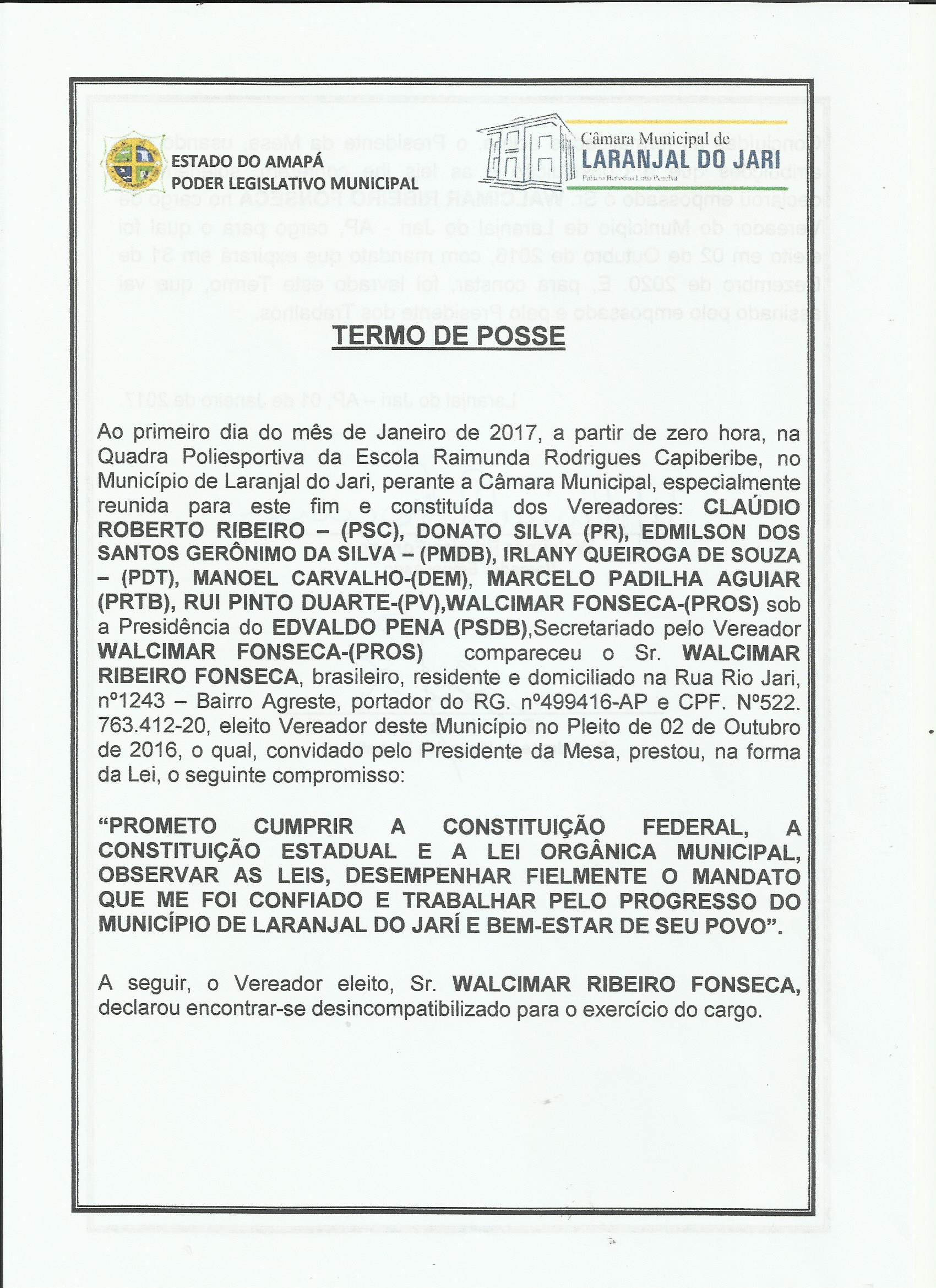 Termo de Posse do Vereador Walcimar Fonseca, Frente.jpg